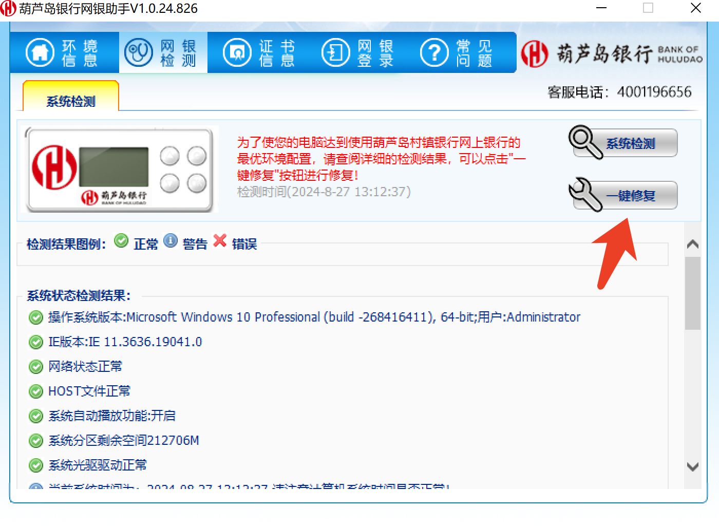 步驟二:打開網(wǎng)銀助手,在開啟網(wǎng)銀助手后稍等片刻,然后點(diǎn)擊一鍵修復(fù),如遇修復(fù)失敗的情況,請(qǐng)關(guān)閉網(wǎng)銀助手,并重新右鍵點(diǎn)擊網(wǎng)銀助手選擇管理員權(quán)限運(yùn)行再進(jìn)行上述操作(一般win7及以上操作系統(tǒng)需要)。